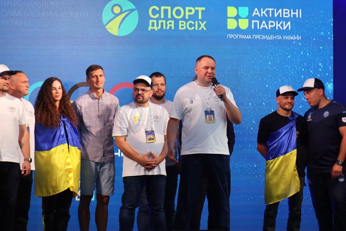 KYIV, UKRAINE - JULY 26, 2024 - State Secretary of the Ukrainian Youth and Sports Ministry Oleksii Perevezentsev (C) speaks during an event to mark the opening ceremony of the Paris 2024 Summer Olympics in the fan zone at the Expocenter of Ukraine (VDNG), Kyiv, capital of Ukraine., Credit:Pavlo Bahmut / Avalon