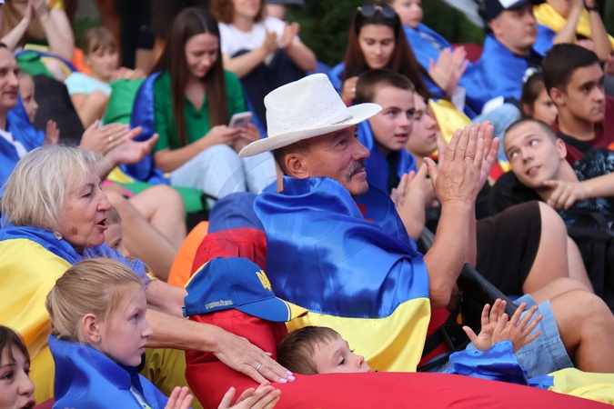 KYIV, UKRAINE - JULY 26, 2024 - People with Ukrainian flags attend an event to mark the opening ceremony of the Paris 2024 Summer Olympics in the fan zone at the Expocenter of Ukraine (VDNG), Kyiv, capital of Ukraine., Credit:Pavlo Bahmut / Avalon