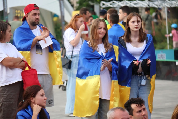 KYIV, UKRAINE - JULY 26, 2024 - People with Ukrainian flags attend an event to mark the opening ceremony of the Paris 2024 Summer Olympics in the fan zone at the Expocenter of Ukraine (VDNG), Kyiv, capital of Ukraine., Credit:Pavlo Bahmut / Avalon