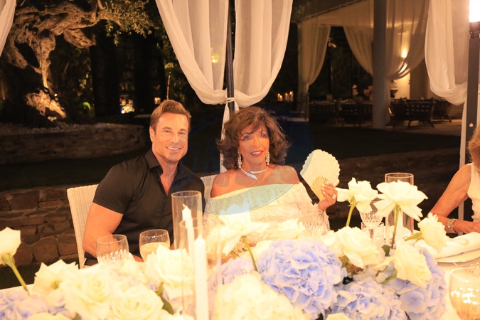 Exclusif - Rene Horsch, Joan Collins - Soirée privée chez le prince Charles et la princesse Camilla de Bourbon des Deux-Siciles au Château de Saint-Tropez à Saint-Tropez, à l'occasion de la présentation du super yacht résidentiel Ulyssia Ce bateau, qui fera 324 mètres de long, soit 55 mètres de plus que le Titanic, sillonnera les mers à partir de 2028, et pourra accueillir 132 résidences privées dans un luxe extraordinaire. Le 30 juillet 2024 © Franz Chavaroche / Bestimage Exclusive - For Germany Call for price - Private party at the Prince and Princess of Bourbon of the Two Sicilies in Saint-Tropez, on the occasion of the presentation of the super residential yacht Ulyssia. This ship, which will be 324 meters long, 55 meters longer than the Titanic, will sail the seas from 2028, and will be able to accommodate 132 private residences in extraordinary luxury. On July 30th 2024