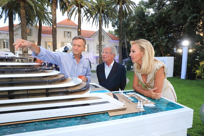 Exclusif - Frank Binder, Olivier Dassault, la princesse Camilla de Bourbon des Deux-Siciles - Soirée privée chez le prince Charles et la princesse Camilla de Bourbon des Deux-Siciles au Château de Saint-Tropez à Saint-Tropez, à l'occasion de la présentation du super yacht résidentiel Ulyssia Ce bateau, qui fera 324 mètres de long, soit 55 mètres de plus que le Titanic, sillonnera les mers à partir de 2028, et pourra accueillir 132 résidences privées dans un luxe extraordinaire. Le 30 juillet 2024 © Franz Chavaroche / Bestimage Exclusive - For Germany Call for price - Private party at the Prince and Princess of Bourbon of the Two Sicilies in Saint-Tropez, on the occasion of the presentation of the super residential yacht Ulyssia. This ship, which will be 324 meters long, 55 meters longer than the Titanic, will sail the seas from 2028, and will be able to accommodate 132 private residences in extraordinary luxury. On July 30th 2024
