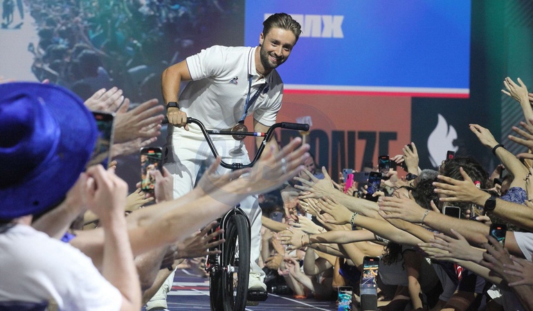 Anthony Jeanjean, médaille de bronze en BMX freestyle au Club France à la Grande Halle de La Villette lors des Jeux Olympiques Paris 2024
