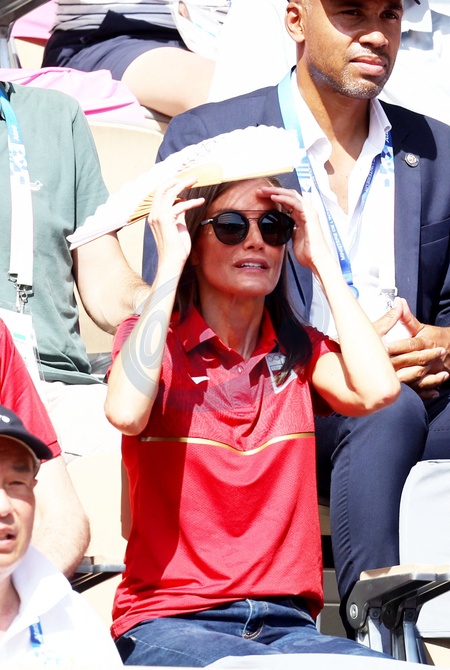 La reine Letizia d’Espagne assiste aux 1/4 de finale de tennis entre Carlos Alcaraz et Tommy Paul lors des Jeux Olympiques de Paris2024 (JO) à Roland Garros