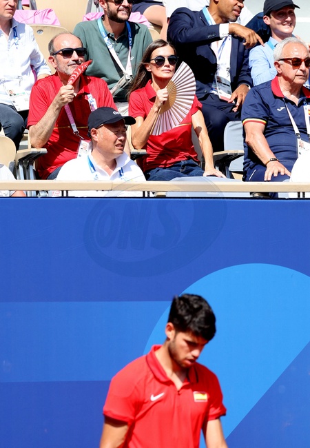 Hiszpańska królowa Letizia uczestniczy w ćwierćfinale tenisa pomiędzy Carlosem Alcarazem i Tommym Paulem podczas Igrzysk Olimpijskich 2024 w Paryżu (OG) na stadionie Roland Garros