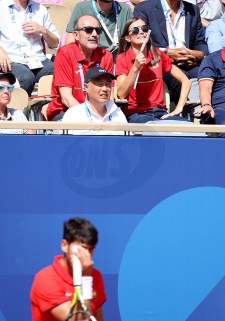 Hiszpańska królowa Letizia uczestniczy w ćwierćfinale tenisa pomiędzy Carlosem Alcarazem i Tommym Paulem podczas Igrzysk Olimpijskich 2024 w Paryżu (OG) na stadionie Roland Garros