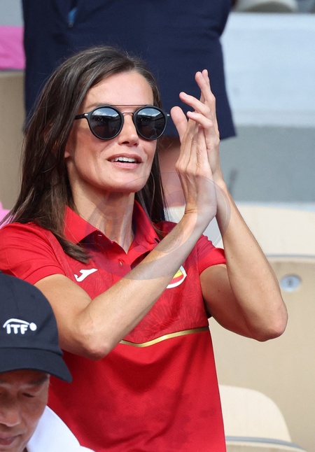 La reine Letizia d’Espagne assiste aux 1/4 de finale de tennis entre Carlos Alcaraz et Tommy Paul lors des Jeux Olympiques de Paris2024 (JO) à Roland Garros