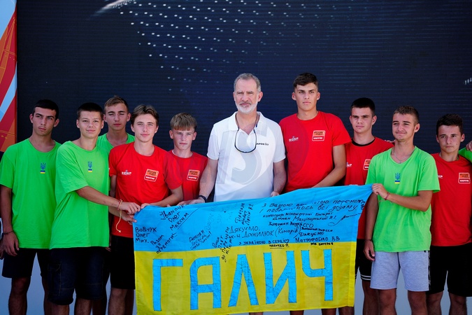 Król Hiszpanii Felipe VI podpisuje ukraińskie flagi dzieciom w Plama Yacht Club na Majorce przed Copa del Rey