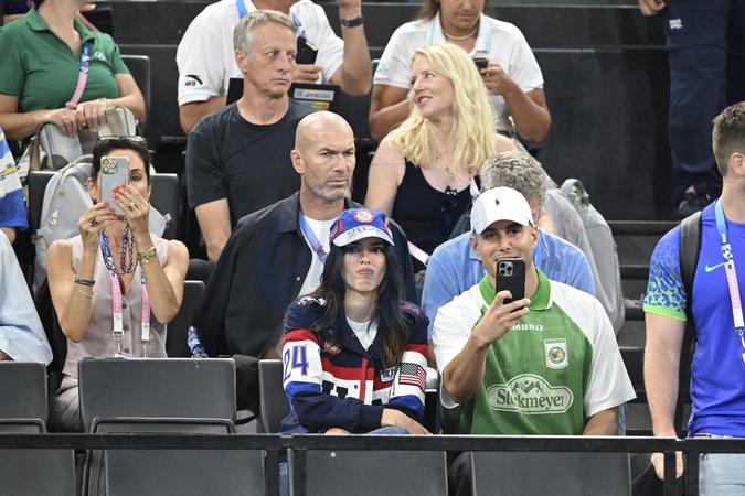 Zinédine Zidane, sa femme Véronique et Kendall Jenner - Les célébrités assistent aux épreuves de Gymnastique artistique féminine, finale du concours général lors des Jeux Olympiques de Paris 2024 (JO) au Palais omnisports Bercy Arena, à Paris, France, le 1er août 20241. © Jacovides-Perusseau/Bestimage Celebrities attend the Women's Artistic Gymnastics All-Around Final during the Paris 2024 Olympic Games (Olympics) at Palais Omnisports Bercy Arena in Paris, France, August 1, 20241.