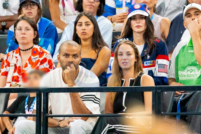 Kendall Jenner, Tony Parker avec sa compagne Agathe Teyssier - Les célébrités assistent aux épreuves de Gymnastique artistique féminine, finale du concours général lors des Jeux Olympiques de Paris 2024 (JO) au Palais omnisports Bercy Arena, à Paris, France, le 1er août 20241. © Jacovides-Perusseau/Bestimage Celebrities attend the Women's Artistic Gymnastics All-Around Final during the Paris 2024 Olympic Games (Olympics) at Palais Omnisports Bercy Arena in Paris, France, August 1, 20241.
