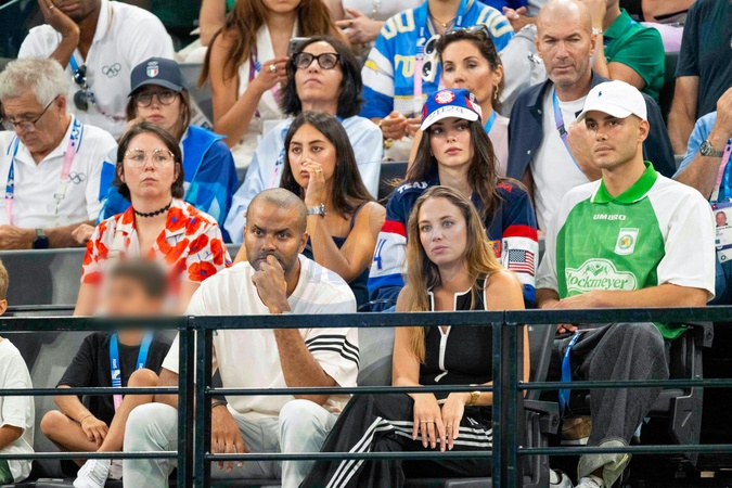 Zinédine Zidane, sa femme Véronique, Kendall Jenner, Tony Parker avec sa compagne Agathe Teyssier - Les célébrités assistent aux épreuves de Gymnastique artistique féminine, finale du concours général lors des Jeux Olympiques de Paris 2024 (JO) au Palais omnisports Bercy Arena, à Paris, France, le 1er août 20241. © Jacovides-Perusseau/Bestimage Celebrities attend the Women's Artistic Gymnastics All-Around Final during the Paris 2024 Olympic Games (Olympics) at Palais Omnisports Bercy Arena in Paris, France, August 1, 20241.