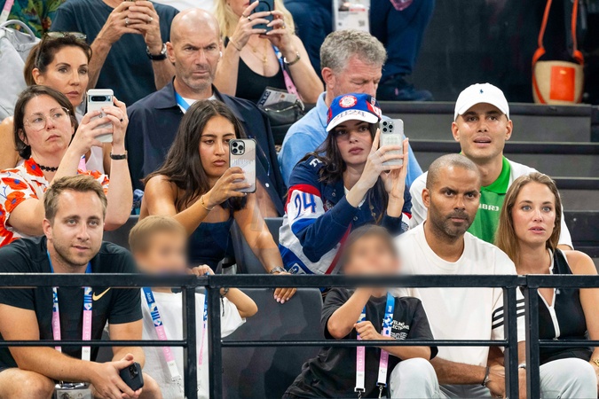 Zinédine Zidane, sa femme Véronique, Kendall Jenner, Tony Parker avec sa compagne Agathe Teyssier - Les célébrités assistent aux épreuves de Gymnastique artistique féminine, finale du concours général lors des Jeux Olympiques de Paris 2024 (JO) au Palais omnisports Bercy Arena, à Paris, France, le 1er août 20241. © Jacovides-Perusseau/Bestimage Celebrities attend the Women's Artistic Gymnastics All-Around Final during the Paris 2024 Olympic Games (Olympics) at Palais Omnisports Bercy Arena in Paris, France, August 1, 20241.
