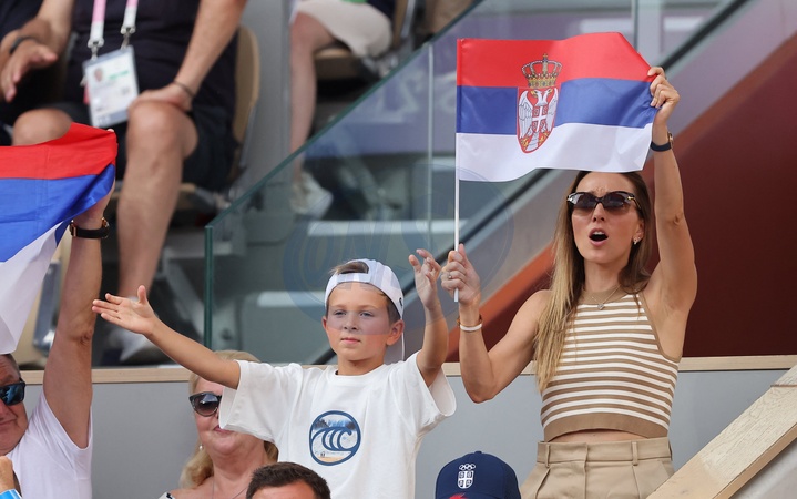 Jelena Djokovic et son fils Stefan - Les célébrités assistent à l'épreuve de tennis du quart de finale Novak Djokovic contre Stefanos Tsitsipas lors des Jeux Olympiques de Paris 2024 (JO) à Roland Garros, à Paris, France, le 1er août 2024. © Jacovides-Perusseau/Bestimage Celebrities attend the quarterfinal tennis match between Novak Djokovic and Stefanos Tsitsipas during the Paris 2024 Olympic Games (Olympics) at Roland Garros in Paris, France, on August 1, 2024.