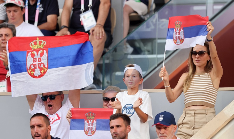 Jelena Djokovic et son fils Stefan accompagnés des parents de Novak Djokovic - Les célébrités assistent à l'épreuve de tennis du quart de finale Novak Djokovic contre Stefanos Tsitsipas lors des Jeux Olympiques de Paris 2024 (JO) à Roland Garros, à Paris, France, le 1er août 2024. © Jacovides-Perusseau/Bestimage Celebrities attend the quarterfinal tennis match between Novak Djokovic and Stefanos Tsitsipas during the Paris 2024 Olympic Games (Olympics) at Roland Garros in Paris, France, on August 1, 2024.