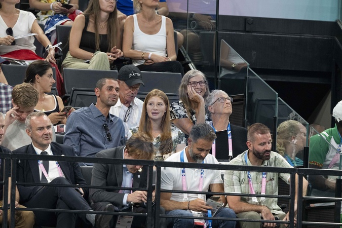 Bill Gates wraz z córką Jennifer Gates i jej mężem, egipskim jeźdźcem Nayelem Nassarem biorą udział w wszechstronnym finale kobiecej gimnastyki artystycznej podczas Igrzysk Olimpijskich w Paryżu w 2024 r.