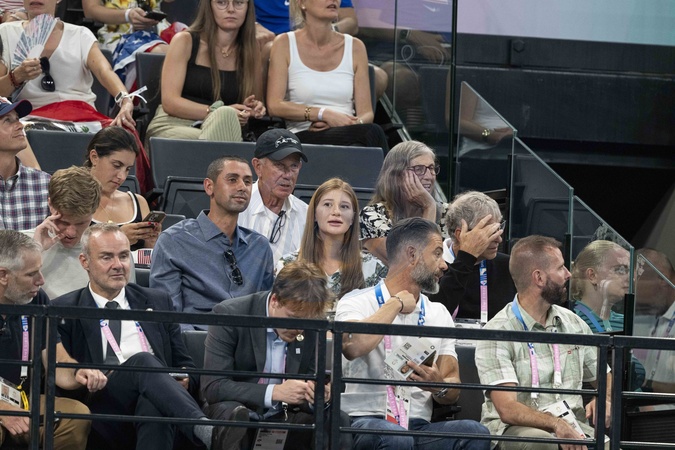 Bill Gates wraz z córką Jennifer Gates i jej mężem, egipskim jeźdźcem Nayelem Nassarem biorą udział w wszechstronnym finale kobiecej gimnastyki artystycznej podczas Igrzysk Olimpijskich w Paryżu w 2024 r.