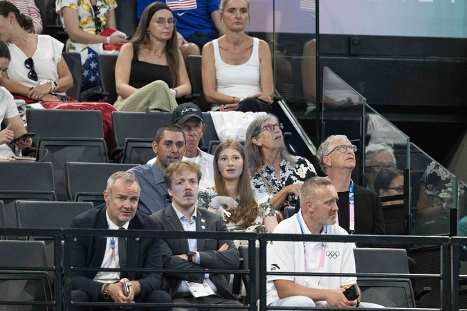 Bill Gates wraz z córką Jennifer Gates i jej mężem, egipskim jeźdźcem Nayelem Nassarem biorą udział w wszechstronnym finale kobiecej gimnastyki artystycznej podczas Igrzysk Olimpijskich w Paryżu w 2024 r.