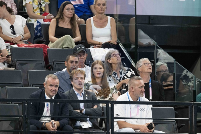 Bill Gates wraz z córką Jennifer Gates i jej mężem, egipskim jeźdźcem Nayelem Nassarem biorą udział w wszechstronnym finale kobiecej gimnastyki artystycznej podczas Igrzysk Olimpijskich w Paryżu w 2024 r.