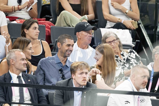 Bill Gates wraz z córką Jennifer Gates i jej mężem, egipskim jeźdźcem Nayelem Nassarem biorą udział w wszechstronnym finale kobiecej gimnastyki artystycznej podczas Igrzysk Olimpijskich w Paryżu w 2024 r.