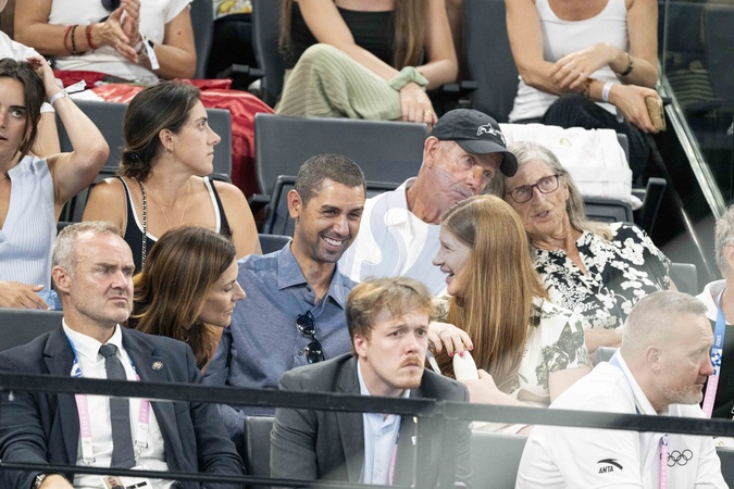 Bill Gates wraz z córką Jennifer Gates i jej mężem, egipskim jeźdźcem Nayelem Nassarem biorą udział w wszechstronnym finale kobiecej gimnastyki artystycznej podczas Igrzysk Olimpijskich w Paryżu w 2024 r.