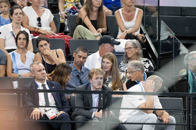 Bill Gates wraz z córką Jennifer Gates i jej mężem, egipskim jeźdźcem Nayelem Nassarem biorą udział w wszechstronnym finale kobiecej gimnastyki artystycznej podczas Igrzysk Olimpijskich w Paryżu w 2024 r.