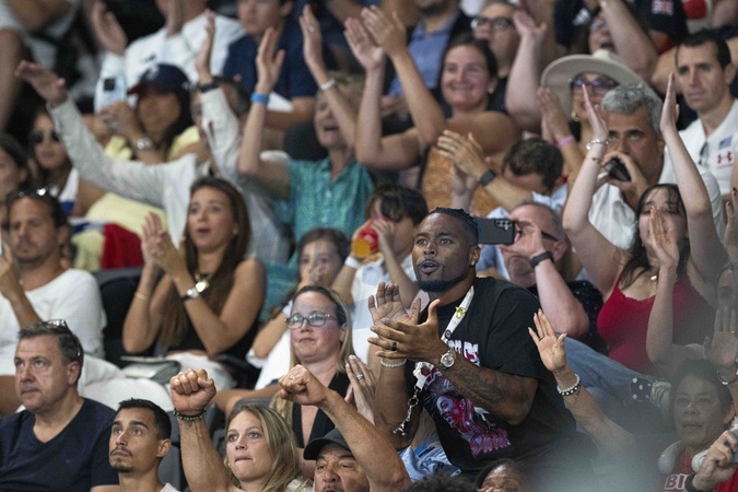 Simone Biles przed swoim towarzyszem Jonathanem Owensem oraz jej rodzicami Nellie Biles i Ronaldem Bilesem podczas zawodów gimnastyki artystycznej kobiet, wszechstronnego finału podczas Igrzysk Olimpijskich w Paryżu w 2024 r.