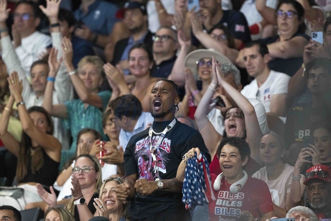 Simone Biles devant son compagnon Jonathan Owens et ses parents Nellie Biles et Ronald Biles lors des épreuves de Gymnastique artistique féminine, finale du concours général lors des Jeux Olympiques de Paris 2024 (JO)