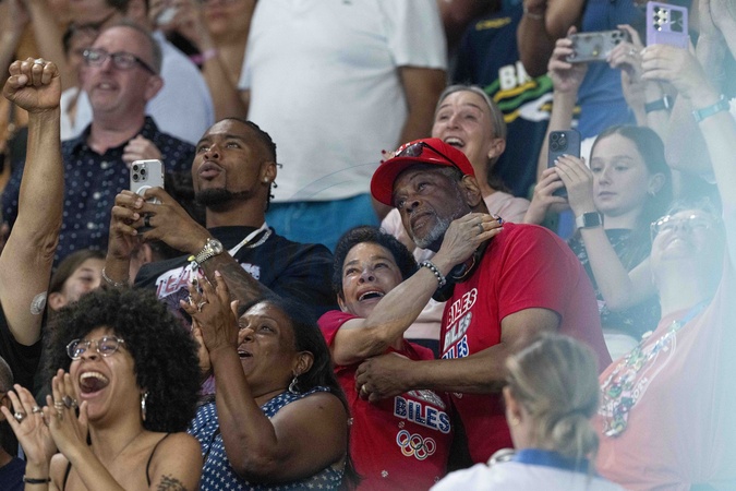 Simone Biles przed swoim towarzyszem Jonathanem Owensem oraz jej rodzicami Nellie Biles i Ronaldem Bilesem podczas zawodów gimnastyki artystycznej kobiet, wszechstronnego finału podczas Igrzysk Olimpijskich w Paryżu w 2024 r.