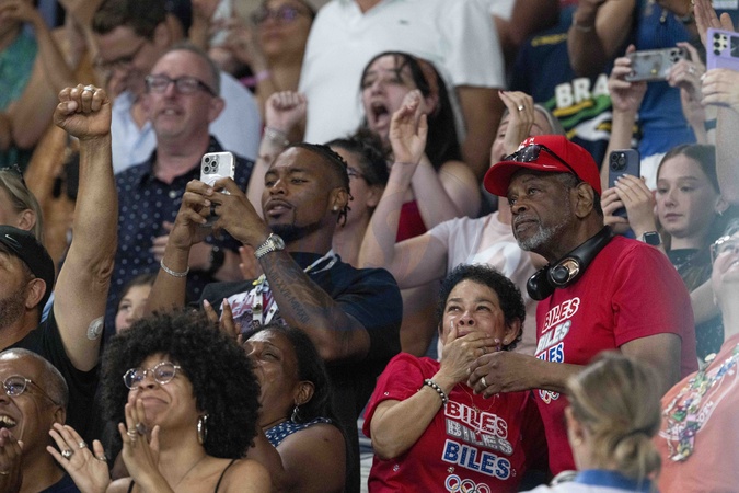 Simone Biles devant son compagnon Jonathan Owens et ses parents Nellie Biles et Ronald Biles lors des épreuves de Gymnastique artistique féminine, finale du concours général lors des Jeux Olympiques de Paris 2024 (JO)