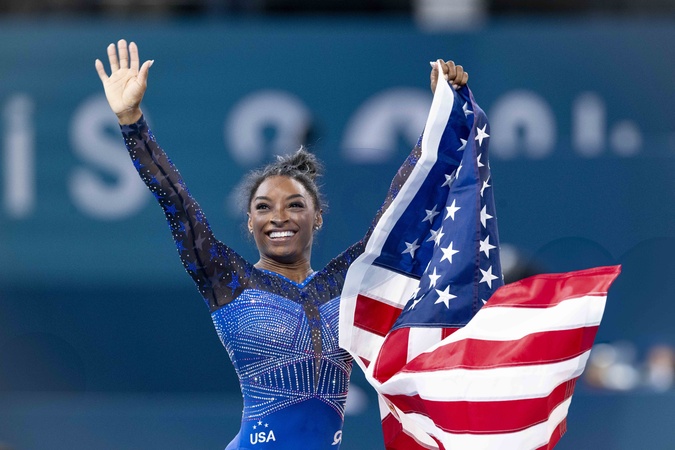Simone Biles przed swoim towarzyszem Jonathanem Owensem oraz jej rodzicami Nellie Biles i Ronaldem Bilesem podczas zawodów gimnastyki artystycznej kobiet, wszechstronnego finału podczas Igrzysk Olimpijskich w Paryżu w 2024 r.