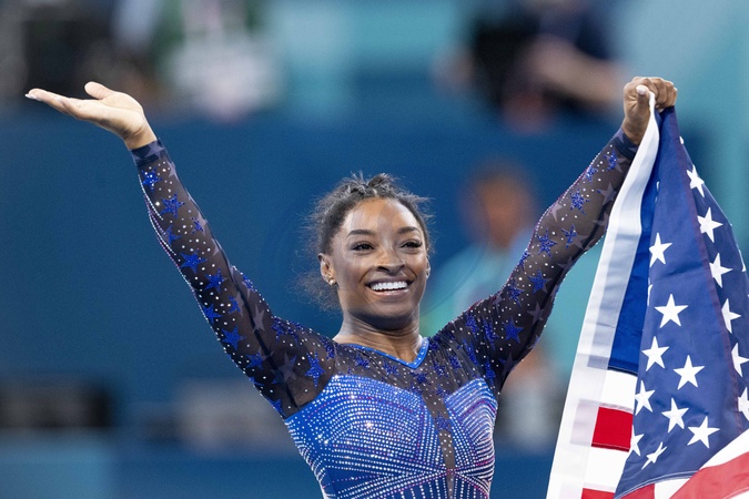 Simone Biles przed swoim towarzyszem Jonathanem Owensem oraz jej rodzicami Nellie Biles i Ronaldem Bilesem podczas zawodów gimnastyki artystycznej kobiet, wszechstronnego finału podczas Igrzysk Olimpijskich w Paryżu w 2024 r.