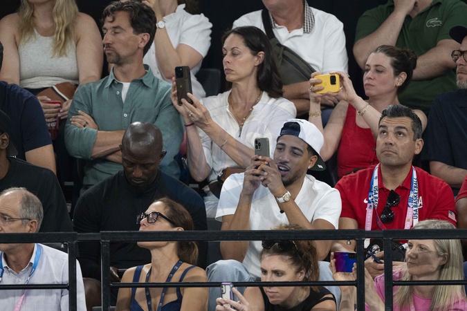 Les célébrités assistent aux épreuves de Gymnastique artistique féminine, finale du concours général lors des Jeux Olympiques de Paris 2024 (JO) au Palais omnisports Bercy Arena, à Paris, France, le 1er août 20241. © Jacovides-Perusseau/Bestimage Celebrities attend the Women's Artistic Gymnastics All-Around Final during the Paris 2024 Olympic Games (Olympics) at Palais Omnisports Bercy Arena in Paris, France, August 1, 2024 - Les célébrités assistent aux épreuves de Gymnastique artistique féminine, finale du concours général lors des Jeux Olympiques de Paris 2024 (JO) au Palais omnisports Bercy Arena, à Paris, France, le 1er août 2024. © Jacovides-Perusseau/Bestimage Celebrities attend the Women's Artistic Gymnastics All-Around Final during the Paris 2024 Olympic Games (Olympics) at Palais Omnisports Bercy Arena in Paris, France, August 1, 2024