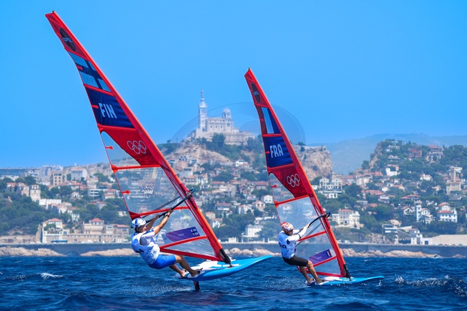Jakob Eklund (Finland) and Nicolas Goyard (France), Men's Windsurfing- Sailing, during the Olympic Games Paris 2024. (Photo Norbert Scanella / DPPI Media / Panoramic