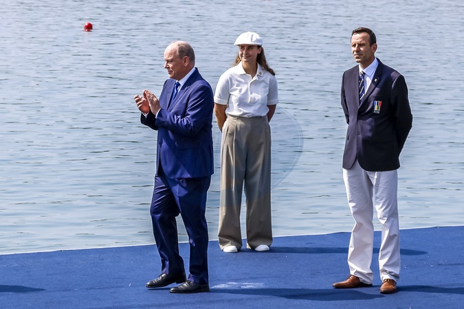 Książę Monako Albert II bierze udział w zawodach wioślarskich podczas Igrzysk Olimpijskich w Paryżu w 2024 r. na stadionie żeglarskim Vaires-sur-Marne