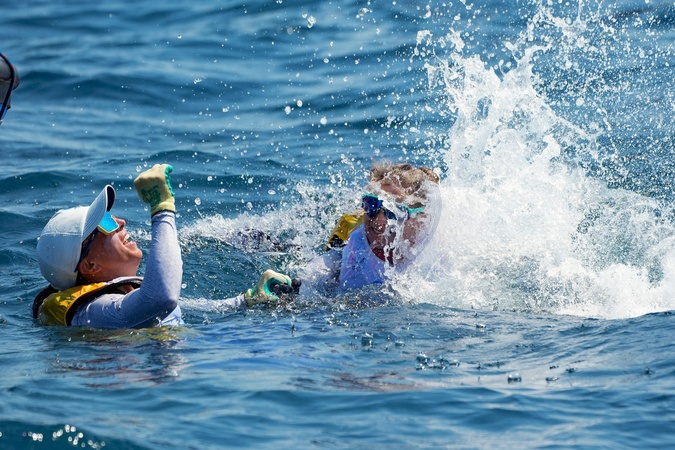 Charline Picon and Sarah Steyaert (France) - 49er FX - Sailing, Skiff during the Olympic Games Paris 2024 at the Marseille marina, France, on August 2, 2024. © Norbert Scanella/Panoramic/Bestimage