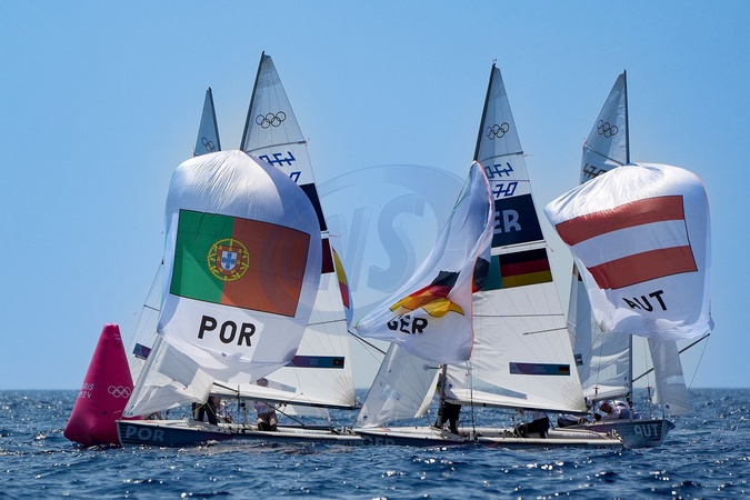 Passing the buoy during Mixed Dinghy race - Sailing, during the Olympic Games Paris 2024