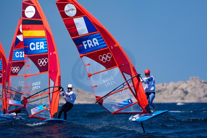 Helene Noesmoen (France) and Theresa Marie Steinlein (Germany) during the final women's windsurfing Medal Race - Sailing, during the Olympic Games Paris 2024. (Photo Norbert Scanella / DPPI Media / Panoramic)