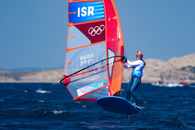 Sharon Kantor (Israel) during the final women's windsurfing Medal Race - Sailing, during the Olympic Games Paris 2024. (Photo Norbert Scanella / DPPI Media / Panoramic)