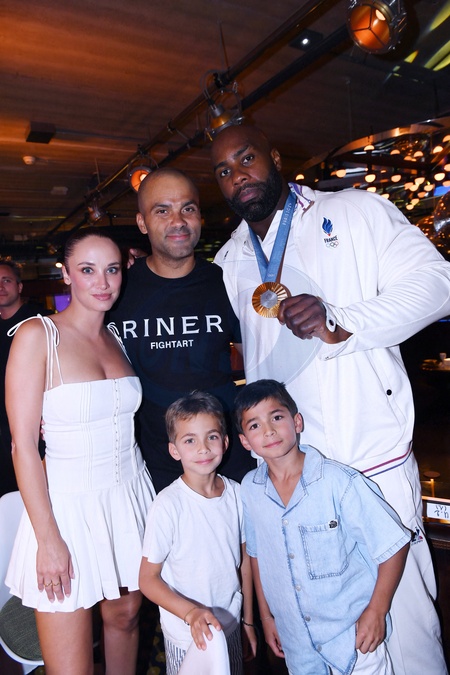 Exclusif - Prix Spécial - No Web - Tony Parker avec sa compagne Agathe Teyssier et ses enfants Josh et Liam, Teddy Riner - Teddy Riner fête son titre de champion Olympique de judo +100KG au restaurant "Podium" du groupe (Les bistrots Pas Parisiens) à Paris le 2 aout 2024. © Rachid Bellak/Bestimage Exclusive - For Germany call for price - No Web - Teddy Riner celebrates his Olympic judo champion title +100KG at the group's "Podium" restaurant (Les bistrots Pas Parisiens) in Paris on August 2, 2024 No Web For Belgium and Switzerland