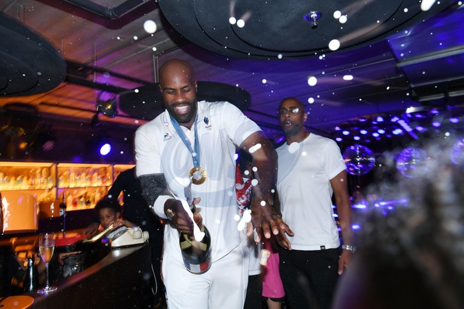 Exclusif - Prix Spécial - No Web - Teddy Riner - Teddy Riner fête son titre de champion Olympique de judo +100KG au restaurant "Podium" du groupe (Les bistrots Pas Parisiens) à Paris le 2 aout 2024. © Rachid Bellak/Bestimage Exclusive - For Germany call for price - No Web - Teddy Riner celebrates his Olympic judo champion title +100KG at the group's "Podium" restaurant (Les bistrots Pas Parisiens) in Paris on August 2, 2024 No Web For Belgium and Switzerland