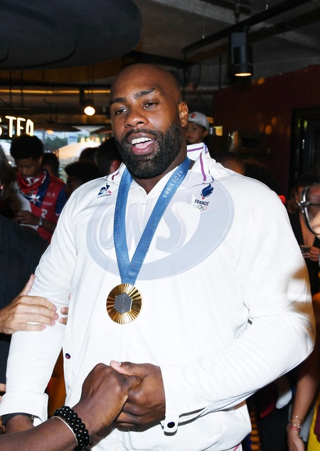 Exclusif - Prix Spécial - No Web - Teddy Riner - Teddy Riner fête son titre de champion Olympique de judo +100KG au restaurant "Podium" du groupe (Les bistrots Pas Parisiens) à Paris le 2 aout 2024. © Rachid Bellak/Bestimage Exclusive - For Germany call for price - No Web - Teddy Riner celebrates his Olympic judo champion title +100KG at the group's "Podium" restaurant (Les bistrots Pas Parisiens) in Paris on August 2, 2024 No Web For Belgium and Switzerland