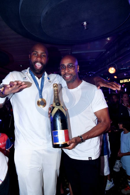 Exclusif - Prix Spécial - No Web - Teddy Riner et Franck Nema, le directeur du groupe (Les bistrots Pas Parisiens) - Teddy Riner fête son titre de champion Olympique de judo +100KG au restaurant "Podium" du groupe (Les bistrots Pas Parisiens) à Paris le 2 aout 2024. © Rachid Bellak/Bestimage Exclusive - For Germany call for price - No Web - Teddy Riner celebrates his Olympic judo champion title +100KG at the group's "Podium" restaurant (Les bistrots Pas Parisiens) in Paris on August 2, 2024 No Web For Belgium and Switzerland