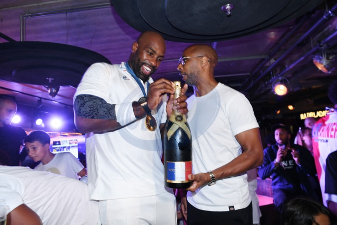 Exclusif - Prix Spécial - No Web - Teddy Riner et Franck Nema, le directeur du groupe (Les bistrots Pas Parisiens) - Teddy Riner fête son titre de champion Olympique de judo +100KG au restaurant "Podium" du groupe (Les bistrots Pas Parisiens) à Paris le 2 aout 2024. © Rachid Bellak/Bestimage Exclusive - For Germany call for price - No Web - Teddy Riner celebrates his Olympic judo champion title +100KG at the group's "Podium" restaurant (Les bistrots Pas Parisiens) in Paris on August 2, 2024 No Web For Belgium and Switzerland