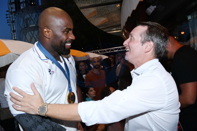Exclusif - Prix Spécial - No Web - Teddy Riner et Stéphane Rotenberg - Teddy Riner fête son titre de champion Olympique de judo +100KG au restaurant "Podium" du groupe (Les bistrots Pas Parisiens) à Paris le 2 aout 2024. © Rachid Bellak/Bestimage Exclusive - For Germany call for price - No Web - Teddy Riner celebrates his Olympic judo champion title +100KG at the group's "Podium" restaurant (Les bistrots Pas Parisiens) in Paris on August 2, 2024 No Web For Belgium and Switzerland