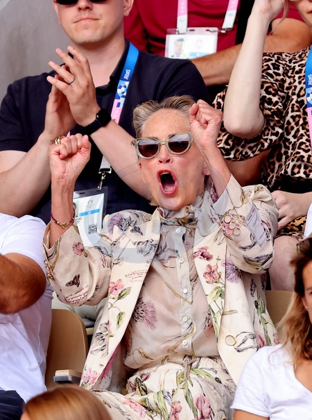 Sharon Stone - Célébrités assistent à la victoire de Novak Djokovic face à Carlos Alcaraz lors de la finale de tennis des Jeux Olympiques de Paris 2024 (JO) sur le cour Philippe Chatrier à Roland Garros, à Paris, France, le 4 Aout 2024. © Jacovides-Perusseau/Bestimage Celebrities attend Novak Djokovic's victory over Carlos Alcaraz in the Paris 2024 Olympic Games (Olympics) tennis final on Philippe Chatrier Court at Roland Garros in Paris, France, August 4, 2024.