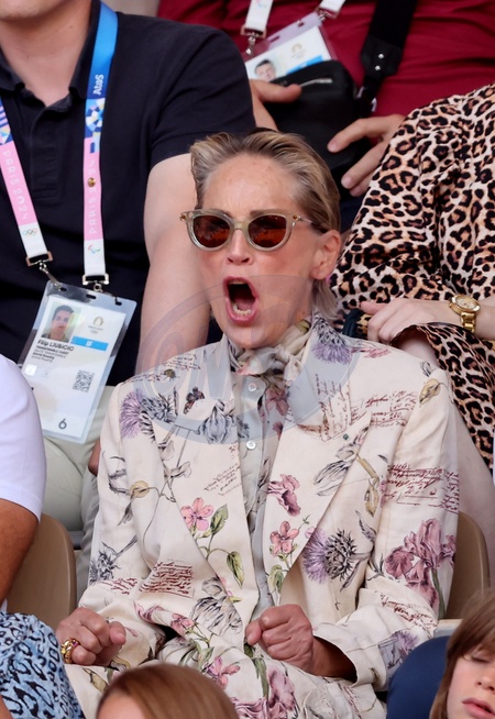 Sharon Stone - Célébrités assistent à la victoire de Novak Djokovic face à Carlos Alcaraz lors de la finale de tennis des Jeux Olympiques de Paris 2024 (JO) sur le cour Philippe Chatrier à Roland Garros, à Paris, France, le 4 Aout 2024. © Jacovides-Perusseau/Bestimage Celebrities attend Novak Djokovic's victory over Carlos Alcaraz in the Paris 2024 Olympic Games (Olympics) tennis final on Philippe Chatrier Court at Roland Garros in Paris, France, August 4, 2024.
