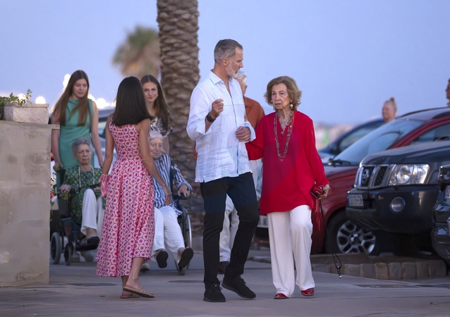 Le roi Felipe VI d'Espagne, la reine Sofia, la reine Letizia, la princesse Leonor, l'infante Sofia - Les membres de la famille royale d'Espagne arrivent au restaurant Mia pour dîner pendant leurs vacances d'été à Majorque le 4 août 2024. © Lalo Yasky / Bestimage King Felipe VI , Queen Letizia, Crown Princess Leonor, Princess Sofia, Princess Irene of Greece, Emerit Queen Sofia, Jean Henri Fruchaud, Tatiana Radziwill - Spanish Royals arrive at the Mia Restaurant for dinner during their summer holidays in Mallorca. Palma de Mallorca - August 4, 2024