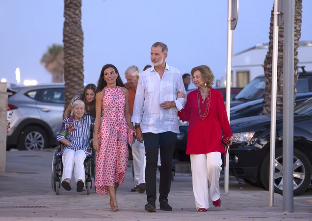 La reine Letizia, le roi Felipe VI d'Espagne, la reine Sofia - Les membres de la famille royale d'Espagne arrivent au restaurant Mia pour dîner pendant leurs vacances d'été à Majorque le 4 août 2024. © Lalo Yasky / Bestimage King Felipe VI , Queen Letizia, Crown Princess Leonor, Princess Sofia, Princess Irene of Greece, Emerit Queen Sofia, Jean Henri Fruchaud, Tatiana Radziwill - Spanish Royals arrive at the Mia Restaurant for dinner during their summer holidays in Mallorca. Palma de Mallorca - August 4, 2024