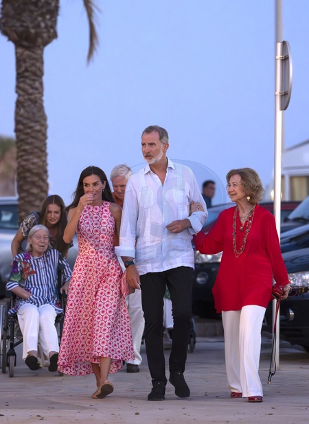 La princesse Leonor, La reine Letizia, le roi Felipe VI d'Espagne, la reine Sofia - Les membres de la famille royale d'Espagne arrivent au restaurant Mia pour dîner pendant leurs vacances d'été à Majorque le 4 août 2024. © Lalo Yasky / Bestimage King Felipe VI , Queen Letizia, Crown Princess Leonor, Princess Sofia, Princess Irene of Greece, Emerit Queen Sofia, Jean Henri Fruchaud, Tatiana Radziwill - Spanish Royals arrive at the Mia Restaurant for dinner during their summer holidays in Mallorca. Palma de Mallorca - August 4, 2024