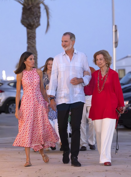 La reine Letizia, le roi Felipe VI d'Espagne, la reine Sofia - Les membres de la famille royale d'Espagne arrivent au restaurant Mia pour dîner pendant leurs vacances d'été à Majorque le 4 août 2024. © Lalo Yasky / Bestimage King Felipe VI , Queen Letizia, Crown Princess Leonor, Princess Sofia, Princess Irene of Greece, Emerit Queen Sofia, Jean Henri Fruchaud, Tatiana Radziwill - Spanish Royals arrive at the Mia Restaurant for dinner during their summer holidays in Mallorca. Palma de Mallorca - August 4, 2024