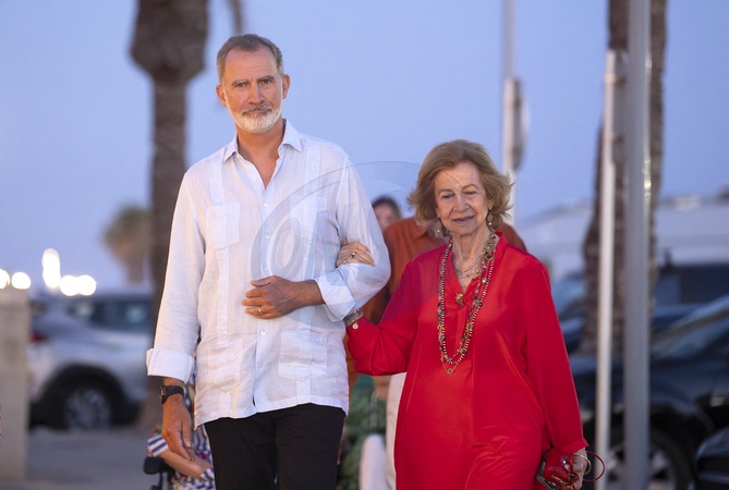 le roi Felipe VI d'Espagne, la reine Sofia - Les membres de la famille royale d'Espagne arrivent au restaurant Mia pour dîner pendant leurs vacances d'été à Majorque le 4 août 2024. © Lalo Yasky / Bestimage King Felipe VI , Queen Letizia, Crown Princess Leonor, Princess Sofia, Princess Irene of Greece, Emerit Queen Sofia, Jean Henri Fruchaud, Tatiana Radziwill - Spanish Royals arrive at the Mia Restaurant for dinner during their summer holidays in Mallorca. Palma de Mallorca - August 4, 2024